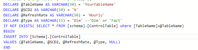 TableName contains the object which should be ingested. NeedSCD2 defines if we need to historize data. RefreshFrequency also can be set. Type is defining if the object is a Dim or Fact table.