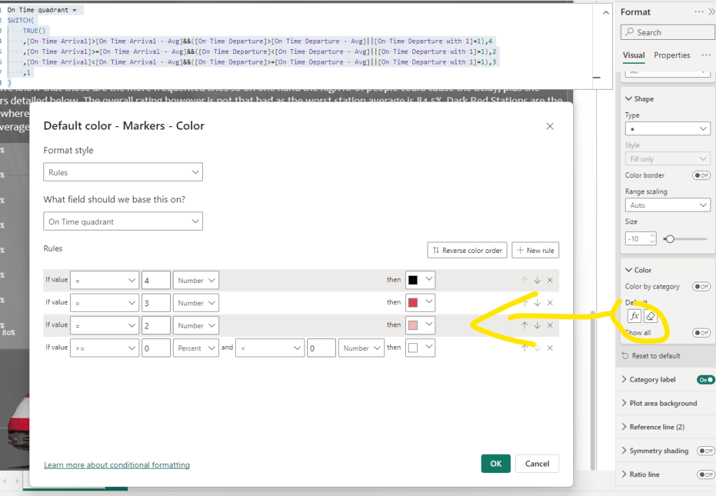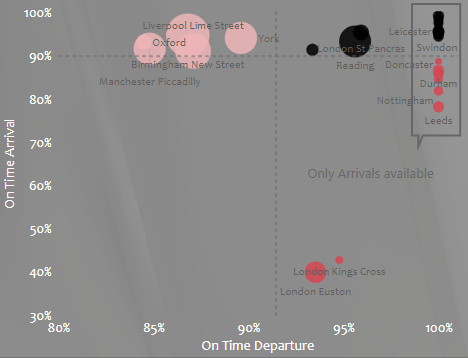 Then I created the Scatter Chart with the latest metric on the X, the Arrival on the Y and the Stations as the Values. Next I had to calculate the averages and create the quadrants:
